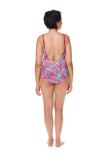 - the placement in front with hand-painted paisley pattern in fresh shades of pink and blue make this swimsuit unique