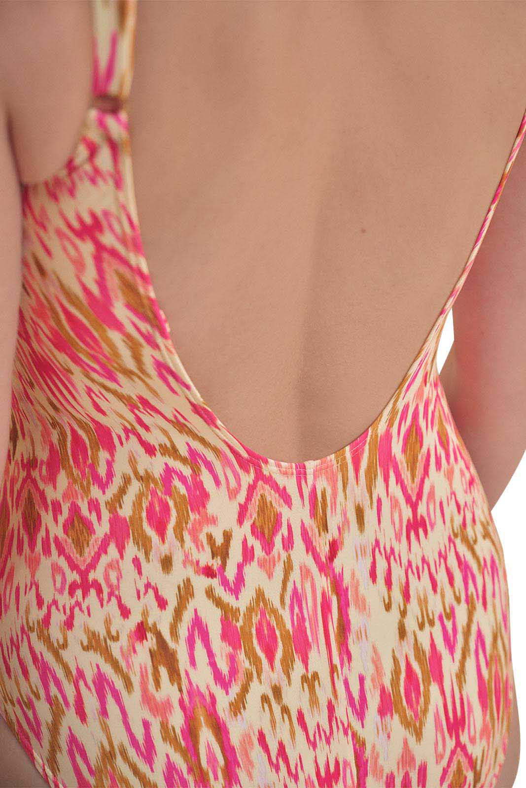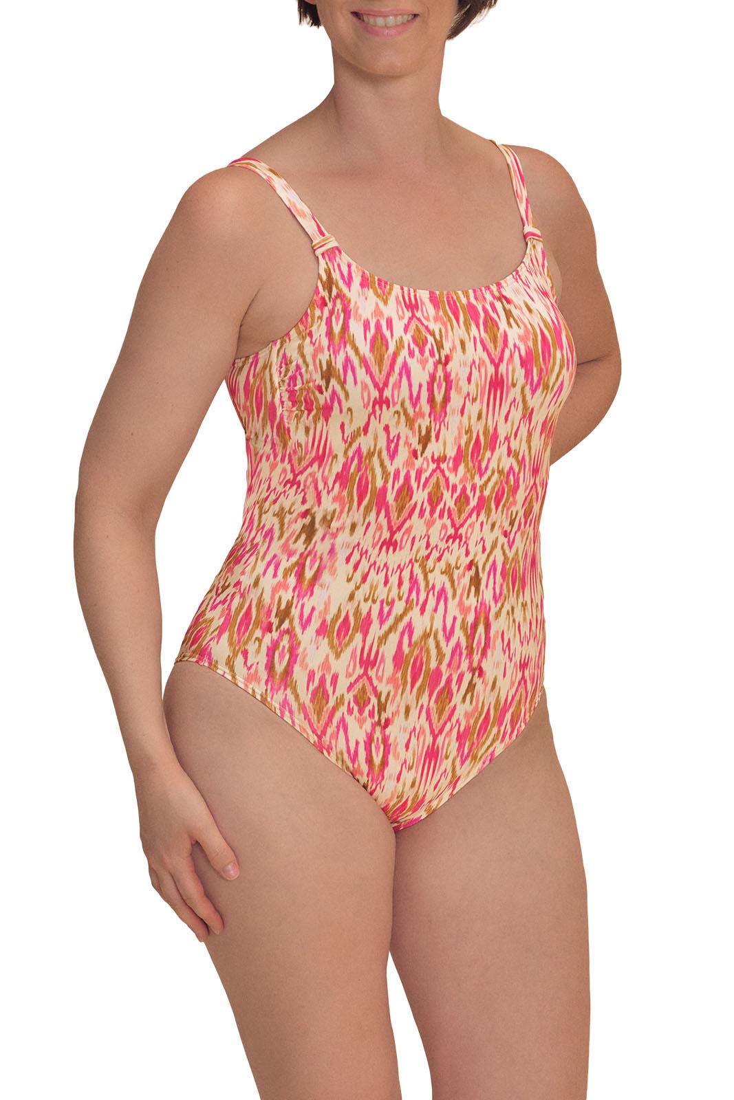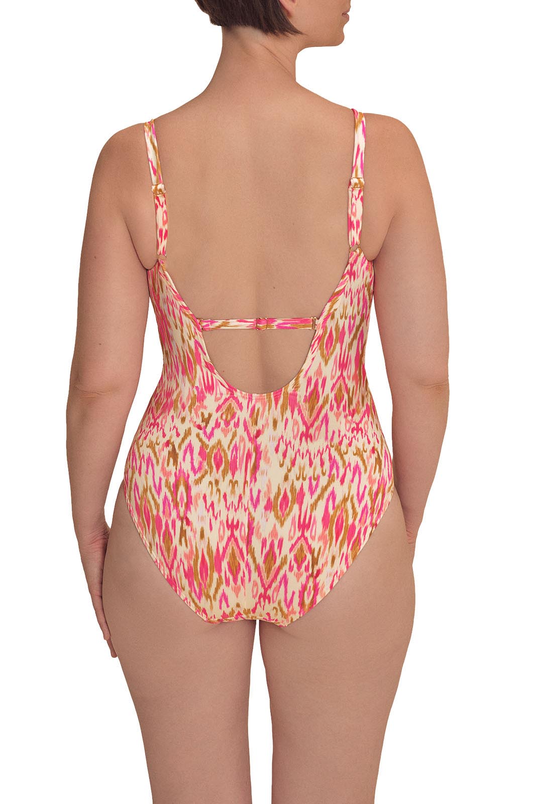 - Ikat-inspired print in pink and earth tones