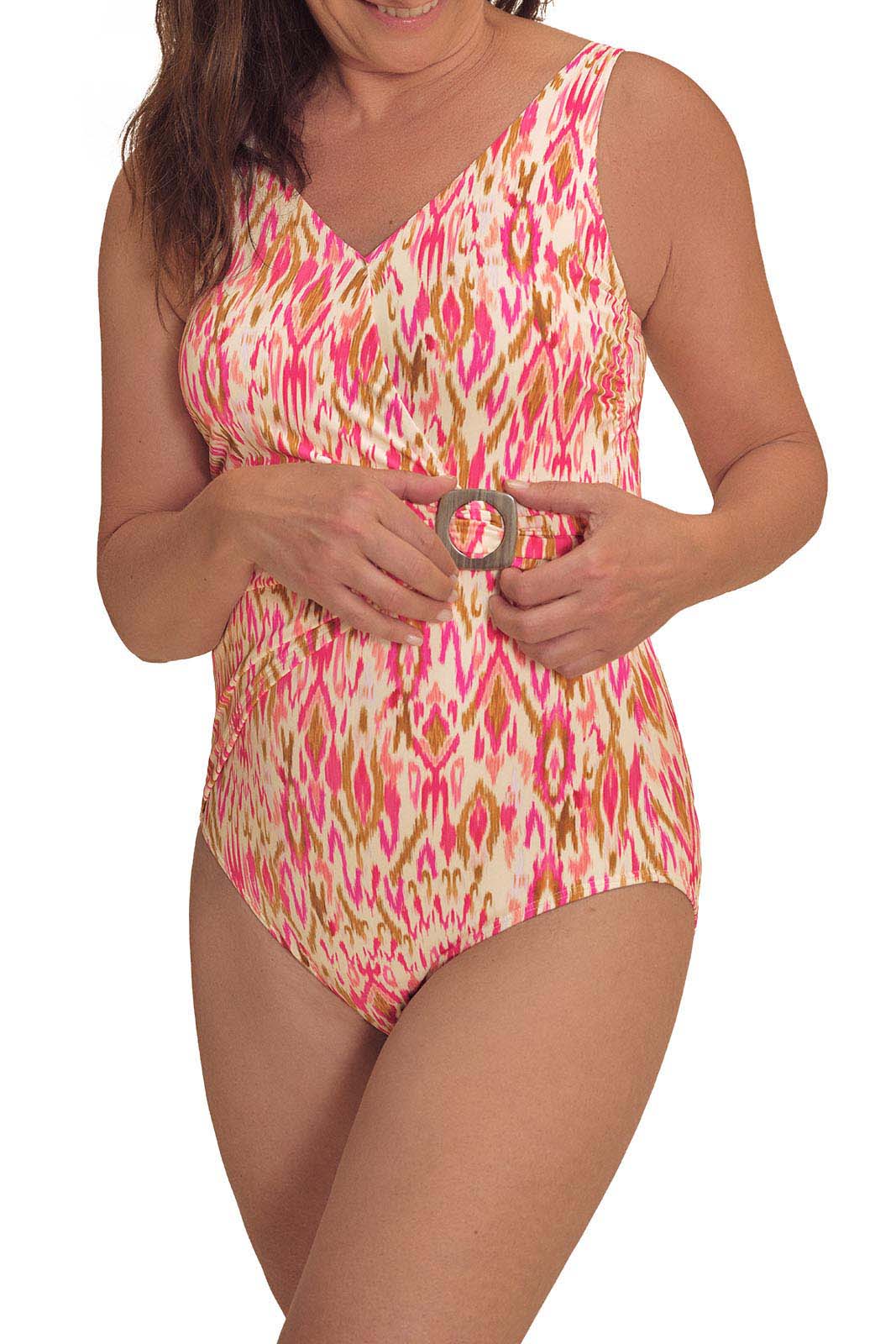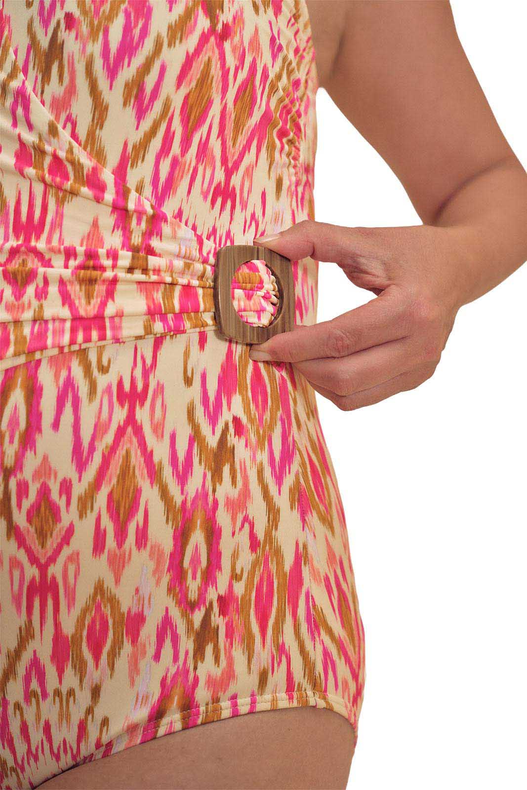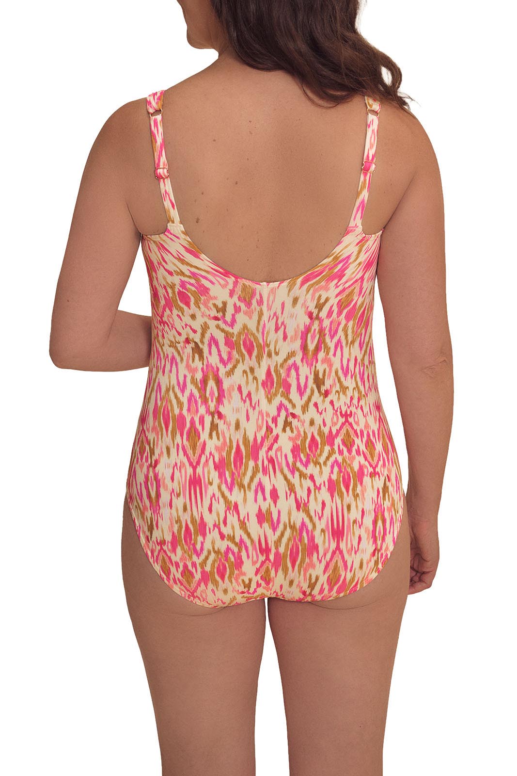 - Ikat-inspired print in pink and earth tones