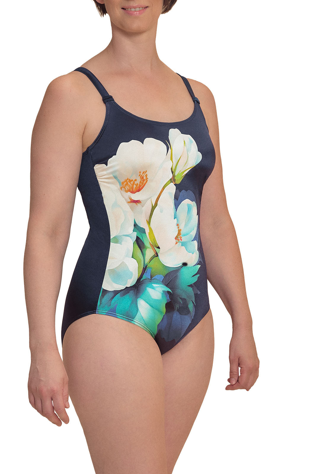 The Lazio One Piece Swimsuit combines innovative design with elegant style, offering both comfort and support for wearers with full or partial prostheses. This swimsuit is crafted to provide a secure fit while enhancing the natural silhouette with its exclusive magnolia placement print.