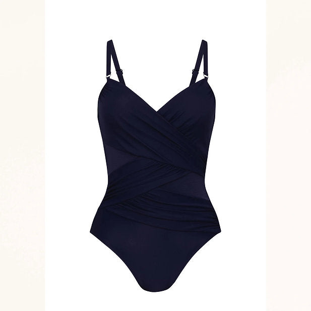 The Jinelle model is an elegant beach shaper. Made from innovative Shape Satin fabric, it provides expertly designed figure-shaping properties. The sophisticated cut, complemented by gathers and tulle inserts, flatters the feminine silhouette. A perfect blend of matt and shiny fabrics creates a unique look. Ideal for self-confident women who want to look stylish on the beach or by the pool.