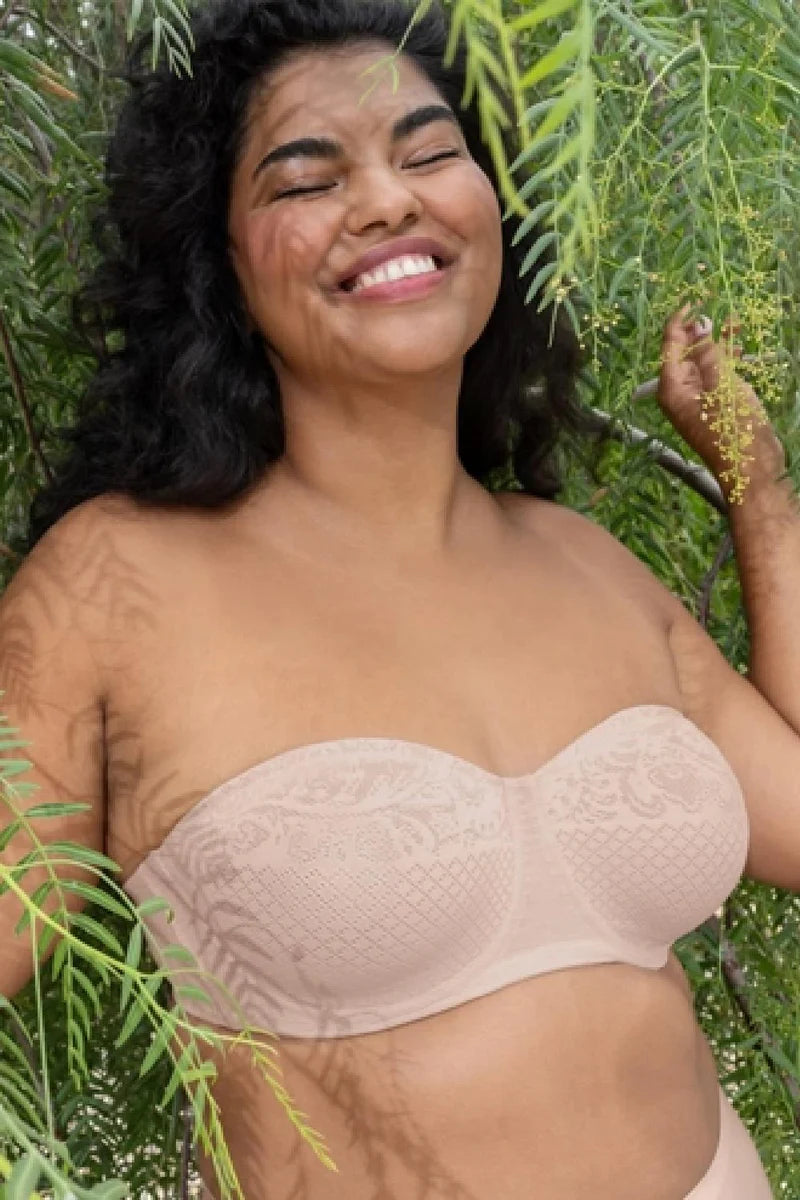 This adorable strapless bra has semi-sheer lace cups with a supportive underwire. Bra stays in place with silicone gripper at inner edges and has flexible side seam boning. Minimizing effect helps keep buttons from popping off tailored shirts. Made of nylon and spandex.