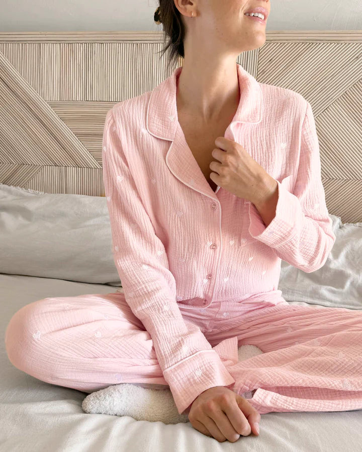 Indulge in a luxurious night's sleep with the Lottie Love Sleep Set, where comfort meets REM. Crafted from 100% cotton, this sleep set envelops you in softness, ensuring a serene slumber. Adorned with custom embroidered hearts, its sophisticated notch collar and button-down design exude timeless charm, while the chest pocket and delicate piping trim add a refined finish.